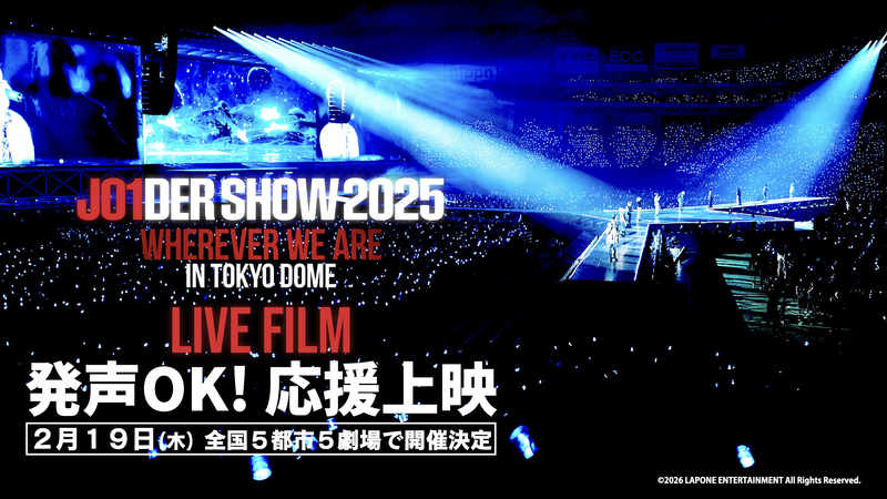 現在全国公開中の、グローバルボーイズグループJO1初のライブ映画作品『JO1DER SHOW 2025 ʻWHEREVER WE AREʼ IN TOKYO DOME – LIVE FILM』において、【副⾳声付き上映】および【発声OK︕応援上映】の実施が決定いたしました。『JO1DER SHOW 2025 ʻWHEREVER WE AREʼ IN TOKYO DOME – LIVE FILM』は、昨年4⽉に開催されたJO1初の単独東京ドーム公演が映画化した作品で、⼤迫⼒のパフォーマンスを楽しむことができ、通常版に加え、SCREENX、4DX、ULTRA4DXの各種ラージフォーマットでも同時公開。