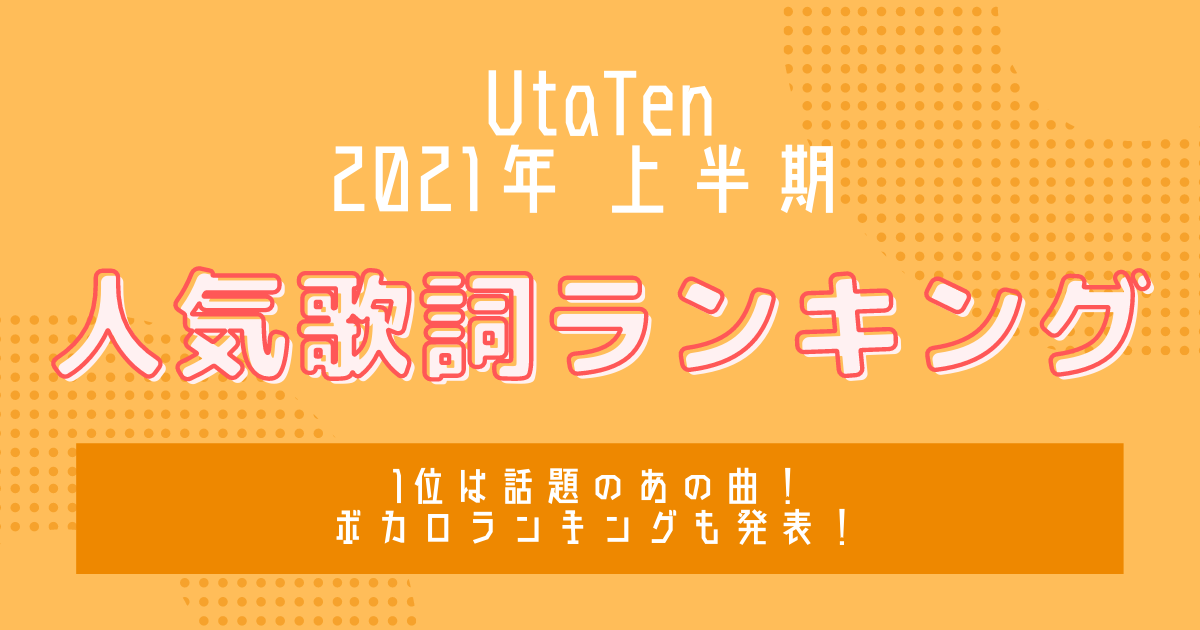 【2021年上半期】人気歌詞ランキング TOP10!ボカロランキングも発表! (1/2) 特集 2021年上半期にUtaTenで人気を集めた歌詞TOP10をご紹介!TikTokなどでバズったボカロ曲のランキングも発表します! 更新日:2021年7月2日 この記事の目次 [表示] ・2021年上半期人気歌詞をご紹介! ・1位 「廻廻奇譚」Eve ・2位 「うっせぇわ」Ado ・3位 「怪物」YOASOBI ・4位 「ギラギラ」Ado ・5位 「夜に駆ける」YOASOBI ・6位 「ドライフラワー」優里 ・7位 「Cry Baby」Official髭男dism ・8位 「10月無口な君を忘れる」あたらよ ・9位 「寄り酔い」和ぬか ・10位 「勿忘」Awesome City Club ・ボカロ 歌詞ランキング ・1位 「グッバイ宣言」ちのぞー ・2位 「ヴァンパイア」DECO*27 ・3位 「キュートなカノジョ」syudou ・4位 「エンヴィーベイビー」Kanaria ・5位 「ヒバナ」DECO*27 ・6位 「ラブカ?」柊キライ ・7位 「KING」Kanaria ・8位 「It's A Whole World」ぼっち ・9位 「回る空うさぎ」Orangestar ・10位 「限りなく灰色へ」すりぃ 2021年上半期人気歌詞をご紹介! 2021年上半期にUtaTenでよく見られた歌詞TOP10をランキング形式で発表! 普段ボカロを聴かない人でも、TikTokでバズったことにより口ずさめる曲もたくさんあるかもしれませんね! UtaTenで人気のあるボカロだけのランキングも発表しているので要チェックです! 1位 「廻廻奇譚」Eve 廻廻奇譚 Eve TVアニメ「呪術廻戦」 オープニングテーマ歌詞を見る 【Eve本人から独占コメント到着!】Eveの「廻廻奇譚」が、UtaTen歌詞ランキングでデイリー&ウィークリー1位を獲得! 2位 「うっせぇわ」Ado うっせぇわ Ado 歌詞を見る Ado「うっせぇわ」の歌詞の意味に迫る!右に倣えの社会に一喝 3位 「怪物」YOASOBI 怪物 YOASOBI TVアニメ「BEASTARS」第2期オープニングテーマ歌詞を見る YOASOBI「怪物」歌詞の意味を徹底解釈!自身を貫く大切さを教えてくれる? 4位 「ギラギラ」Ado ギラギラ Ado 歌詞を見る Ado「ギラギラ」の歌詞の意味は?少女が持つ劣等感や強さに注目 5位 「夜に駆ける」YOASOBI 夜に駆ける YOASOBI 歌詞を見る 「夜に駆ける」の歌詞の意味とは?YOASOBIが物語を音楽で表現した世界に浸る 6位 「ドライフラワー」優里 ドライフラワー 優里 歌詞を見る 優里が「ドライフラワー」の歌詞に描くのは散らない恋心 7位 「Cry Baby」Official髭男dism Cry Baby Official髭男dism TVアニメ「東京リベンジャーズ」 オープニングテーマ歌詞を見る Official髭男dism「Cry baby」アニメ主題歌として歌詞に込められた意味とは? 8位 「10月無口な君を忘れる」あたらよ 10月無口な君を忘れる あたらよ 歌詞を見る あたらよ「10月無口な君を忘れる」歌詞の意味に涙。切なさと2人の関係を探る 9位 「寄り酔い」和ぬか 寄り酔い 和ぬか 歌詞を見る 和ぬか「寄り酔い」色っぽすぎる歌詞が話題!「寄りで酔いたいの」の意味を考察 10位 「勿忘」Awesome City Club 勿忘 Awesome City Club 映画「花束みたいな恋をした」インスパイアソング歌詞を見る Awesome City Club「勿忘」歌詞の意味を考察!タイトルに込められた想いとは 次ページ : ボカロ 歌詞ランキング1位はあの曲! 1 2 次へ 最新のコラム&特集をもっと見る