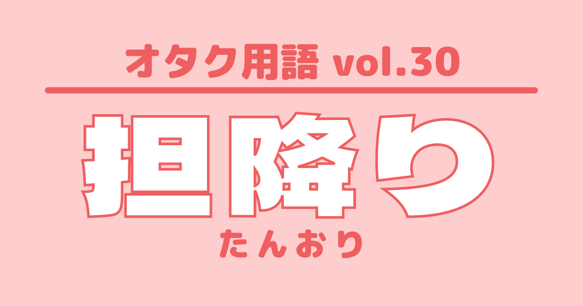 【オタク用語 vol.30】担降りとは?意味・使い方・例文 特集 #オタク用語 [この記事の画像を見る(全1枚)] 新米アイドルオタクがぶち当たる壁「オタク用語」!謎の言葉に困惑中の方に向けて、UtaTen編集部がオタク用語の意味や例文を紹介する辞典を作っちゃいました!あなたもオタク言葉を使いこなすプロになりましょう! 更新日:2021年7月15日 この記事の目次 [表示] ・「担降り」の意味 ・「担降り」を使った例文 ・オタク用語一覧 「担降り」の意味 応援していたアイドルのファンを辞めること 担当のアイドルが嫌いになったわけではなく、他に好きなアイドルができた時など、担当と呼べるほどの熱量で応援できなくなった場合に使われる ※主な使用界隈:ジャニーズ 「担降り」を使った例文 5年推してた子から担降りして菊池担になりました Sexy Zone(セクゾ)メンバーの名前・身長・誕生日などプロフィールを徹底解説! timelesz(Sexy Zone) 特集 オタク用語一覧 シンメ DD 他担狩り G メンカラ 自担 同担 量産型オタク リアコ ビジュ ▼ここからチェック!! UtaTenオタク部 最新のコラム&特集をもっと見る