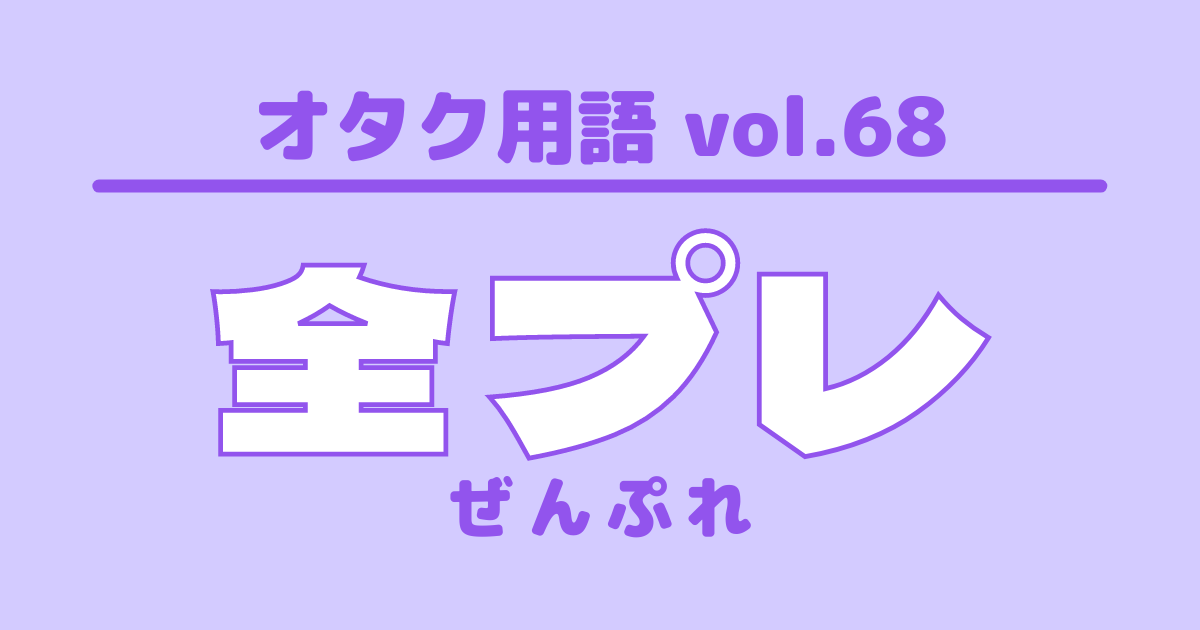 【オタク用語 vol.68】全プレとは?意味・使い方・例文 特集 #オタク用語 新米アイドルオタクがぶち当たる壁「オタク用語」!謎の言葉に困惑中の方に向けて、UtaTen編集部がオタク用語の意味や例文を紹介する辞典を作っちゃいました!あなたもオタク言葉を使いこなすプロになりましょう! 更新日:2021年7月15日 この記事の目次 [表示] ・「全プレ」の意味 ・「全プレ」を使った例文 ・オタク用語一覧 「全プレ」の意味 全員プレゼントの略語 応募者全員が当選し、グッズが提供されることを指す ※主な使用界隈:ジャニーズ 「全プレ」を使った例文 これが全プレ?さすがジャニーズ オタク用語一覧 シンメ DD 他担狩り G メンカラ 自担 同担 量産型オタク リアコ ビジュ ▼ここからチェック!! UtaTenオタク部 最新のコラム&特集をもっと見る