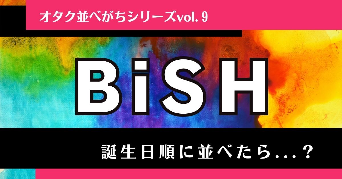 BiSHを誕生日順に並べたら...? 特集 BiSH BiSHを誕生日順に並べてみました! 更新日:2021年8月14日 この記事の目次 [表示] ・BiSHを誕生日順に並べると? ・BiSHを詳しく知りたいなら? BiSHを誕生日順に並べると? リンリン:3月9日 セントチヒロ・チッチ:5月8日 モモコグミカンパニー:9月4日 ハシヤスメ・アツコ:9月27日 アユニ・D:10月12日 アイナ・ジ・エンド:12月27日 【オタク用語一覧】オタク用語の意味・使い方・例文をチェック! BiSHを詳しく知りたいなら? ▼こちらの記事でプロフィールを詳しく紹介しています。 BiSH(ビッシュ)メンバーの本名・年齢は?解散理由や現在の活動を紹介 BiSH 特集 UtaTenオタク部 BiSH アイナ・ジ・エンド、セントチヒロ・チッチ、モモコグミカンパニー、ハシヤスメ・アツコ、リンリン、アユニ・D からなる楽器を持たないパンクバンド。2015年3月に結成。 2018年1月30日から行われる全国12箇所を回る全国ツアー「BiSH pUBLic imAGE LiMiTEd TOUR」は開催前に全公演SOLD OUT。 3··· 歌詞ランキング 関連動画 特集記事 最新情報 最新のコラム&特集をもっと見る