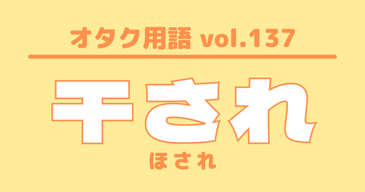 【オタク用語 vol.137】干されとは?意味・使い方・例文 特集 #オタク用語 [この記事の画像を見る(全1枚)] 新米アイドルオタクがぶち当たる壁「オタク用語」!謎の言葉に困惑中の方に向けて、UtaTen編集部がオタク用語の意味や例文を紹介する辞典を作っちゃいました!あなたもオタク言葉を使いこなすプロになりましょう! 更新日:2021年7月21日 この記事の目次 [表示] ・「干され」の意味 ・「干され」を使った例文 ・オタク用語一覧 「干され」の意味 応援しているメンバーからファンサービスが受けられず、目線も合わないこと 「推され」の対義語として、目立った仕事が得られないメンバーを指すこともある ※主な使用界隈:ジャニーズ 「干され」を使った例文 自担に干された…つらい… オタク用語一覧 シンメ DD 他担狩り G メンカラ 自担 同担 量産型オタク リアコ ビジュ ▼ここからチェック!! UtaTenオタク部 最新のコラム&特集をもっと見る