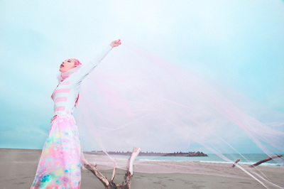 なんで海か?って言われると理由はなくて、ただ海で撮りたかっただけなんですけど、海にありえない格好でいることで不思議な存在感を出したかった。顔にグリッターを塗ったのもハマってただけなんですけど、これも不思議な存在感を出すために使ってます。