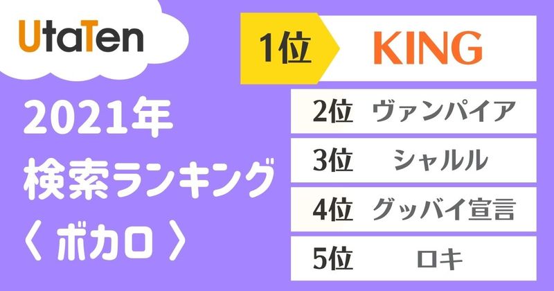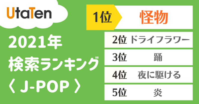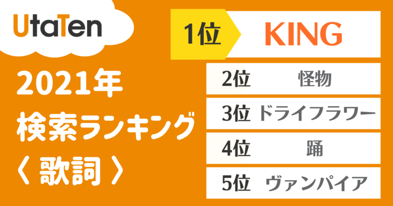 【2021年】UtaTen 検索ランキング ~歌詞~ 特集 2021年にUtaTenで検索された歌詞をランキング形式で発表!※集計期間:2021/01/01~2021/12/15 更新日:2021年12月22日 この記事の目次 [表示] ・歌詞ランキング ・ボカロ ・J-POP 歌詞ランキング ▼▽ランキング結果を共有▽▼ Tweet 歌詞ランキング TOP10 1位 KING 2位 怪物 3位 ドライフラワー 4位 踊 5位 ヴァンパイア 6位 シャルル 7位 グッバイ宣言 8位 夜に駆ける 9位 炎 10位 猫 【UtaTenアーティスト検索ランキングを見る】 ボカロ ボカロランキング TOP10 1位 KING 2位 ヴァンパイア 3位 シャルル 4位 グッバイ宣言 5位 ロキ 6位 ベノム 7位 ヒバナ 8位 ECHO 9位 ヴィラン 10位 命に嫌われている。 J-POP J-POPランキング TOP10 1位 怪物 2位 ドライフラワー 3位 踊 4位 夜に駆ける 5位 炎 6位 猫 7位 ギラギラ 8位 群青 9位 Lemon 10位 うっせぇわ UtaTen編集部 最新のコラム&特集をもっと見る
