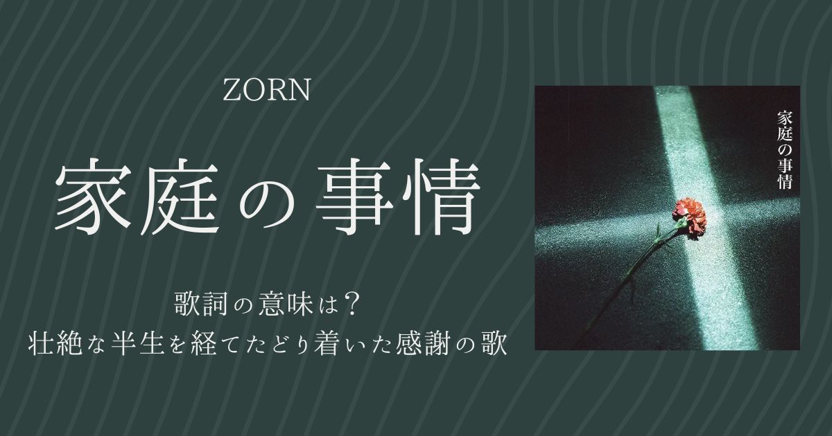ZORNの『家庭の事情』は、想像を絶するような家庭環境で育った彼がどんな景色を見、どのように音楽によって自分の世界を切り拓いていったかを垣間見ることができる楽曲です。私たちひとりひとり、様々な家庭の事情を抱えながら暮らしています。