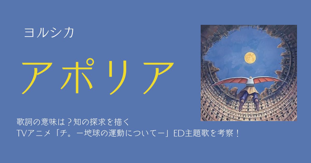 ヨルシカの新曲『アポリア』は、TVアニメ『チ。ー地球の運動についてー』のエンディング主題歌として書き下ろされました。『チ。ー地球の運動についてー』は「ビッグコミックスピリッツ」で連載された魚豊による人気漫画が原作で、15世紀のヨーロッパを舞台に当時禁じられた地動説を命がけで研究する人間たちの生き様と信念を描いた作品です。