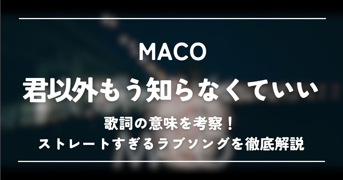 MACOの『君以外もう知らなくていい』は、恋する気持ちがストレートに表現されたラブソングです。「大好き それ以外見つからない」、「君以外もう知らなくていい」など、愛する人に出会えた喜びが綴られています。