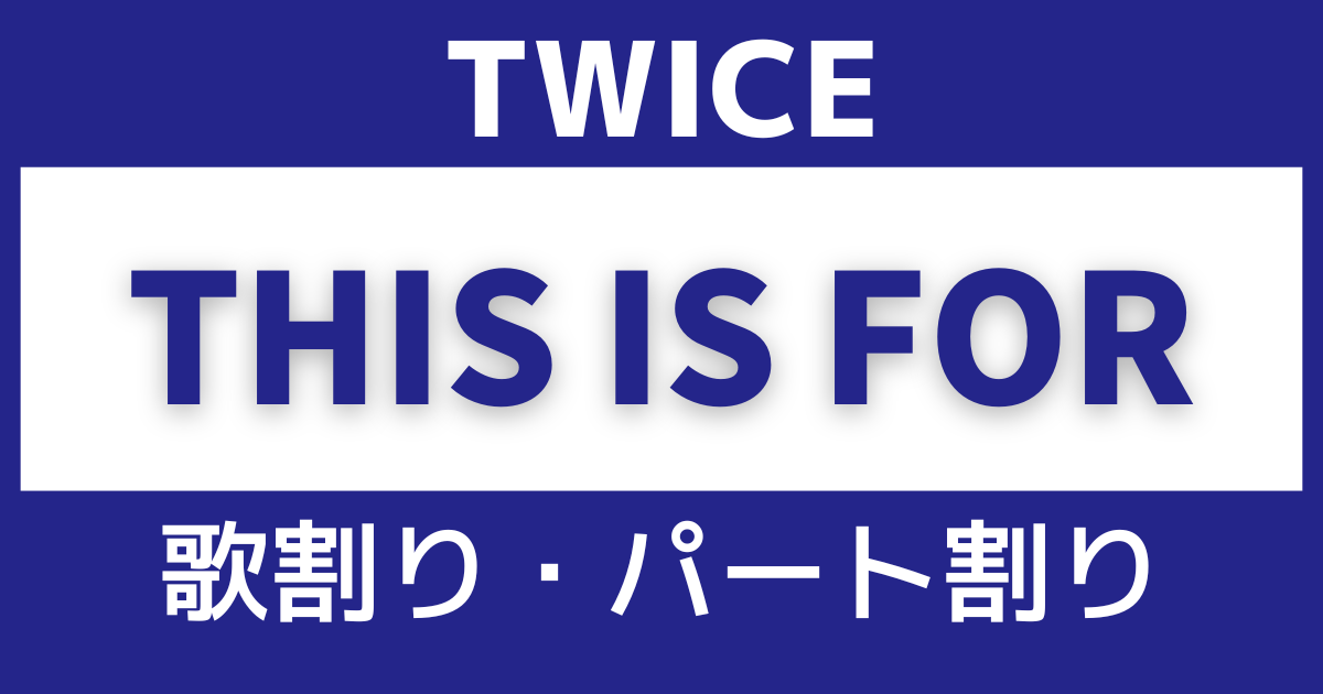 【歌割り・パート割り】TWICE「THIS IS FOR」 歌割り TWICE TWICEの「THIS IS FOR」の歌割り・パート割りをご紹介!歌詞をメンバーカラーで色分けして分かりやすく解説します! 更新日:2025年8月8日 この記事の目次 [表示] ・TWICE「THIS IS FOR」歌割り・パート割り ■メンバーカラー・パート色分け [ナヨン] [ジヒョ] [ジョンヨン] [モモ] [サナ] [ミナ] [ダヒョン] [チェヨン] [ツウィ] [全員] TWICE「THIS IS FOR」歌割り・パート割り THIS IS FOR 歌詞 TWICE ※随時更新! ※この歌割りは一般投稿を元に作成されています。 TWICE(トゥワイス)メンバープロフィール|年齢・名前・カラーを紹介!日本人は? TWICE 特集 UtaTenオタク部 TWICE 《いい音楽で一度、素晴らしいパフォーマンスで二度魅了させる》アジア発9人組ガールズグループ「TWICE」(読み方:トゥワイス)。 2017年6月に最強ベストアルバム『#TWICE』にて日本デビューし日本レコード協会のプラチナディスクに認定。「第68回NHK紅白歌合戦」にも出場。JAPAN 1stシングル『··· 歌詞ランキング 関連動画 特集記事 最新情報 最新のコラム&特集をもっと見る