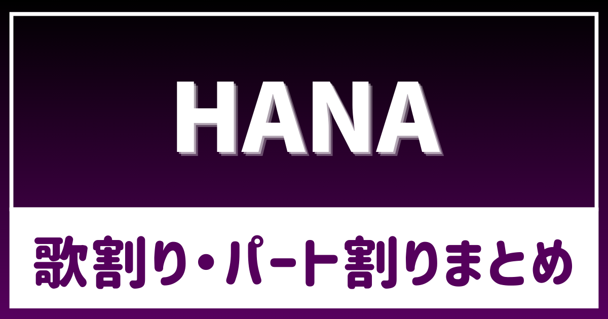 【HANA】歌割り・パート割りまとめ 歌割り HANA HANAの歌割り・パート割りをご紹介!歌詞を色分けして分かりやすく解説します! 更新日:2026年3月30日 この記事の目次 [表示] ・『HANA』2026.2.25 「Bad Girl」 『HANA』2026.2.25 「ALL IN」「Bloom」「NON STOP」「My Body」「BAD LOVE」「Blue Jeans」「Burning Flower」「Tiger」「ROSE」「Drop」 HANA 検定 UtaTenオタク部 HANA BMSG × CHANMINA が手掛けるガールズグループオーディションプロジェクト “No No Girls” から誕生した7人組ガールズグループ HANA。 メンバーは CHIKA / NAOKO / JISOO / YURI / MOMOKA / KOHARU / MAHINA の7名で構成。 圧倒的なライブパフォーマンス、等身大の心情と強さを描く歌詞そして飾··· 歌詞ランキング 関連動画 特集記事 最新情報 最新のコラム&特集をもっと見る