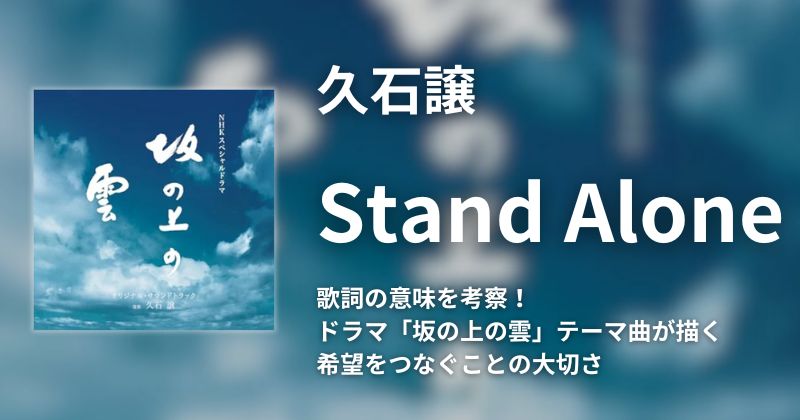久石譲作曲の『Stand Alone』は、明日を信じる希望の歌です。ドラマ『坂の上の雲』のテーマ曲で、登場人物達の姿とリンクする歌詞は、聴く人の心を揺さぶりました。